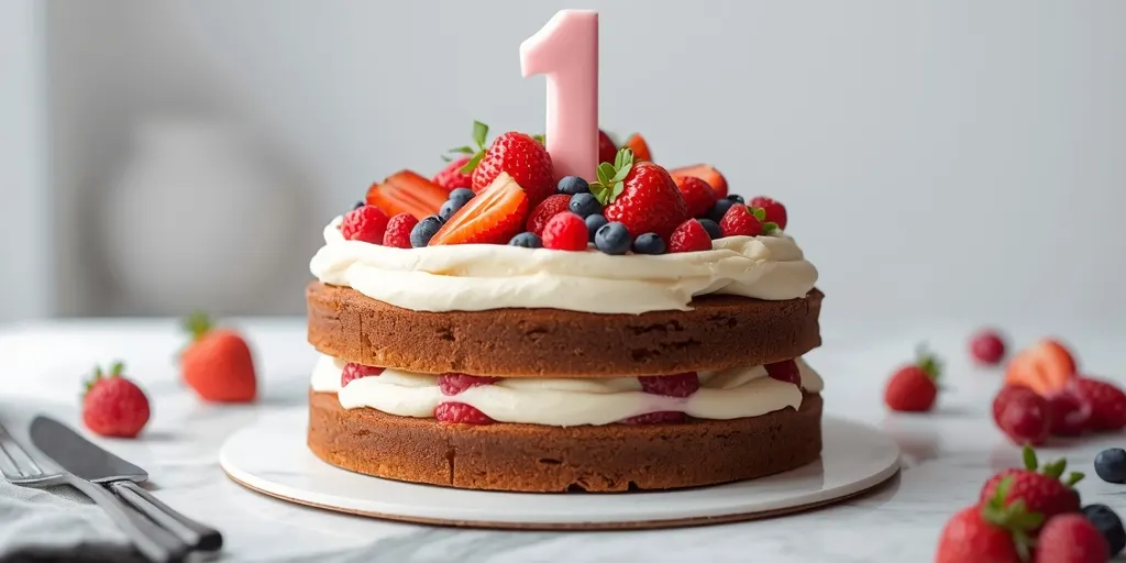This Berry Sweet First Birthday Cake combines fresh berries, creamy frosting, and charming pink decorations. Perfect for your child's special day, it's both delicious and visually appealing.