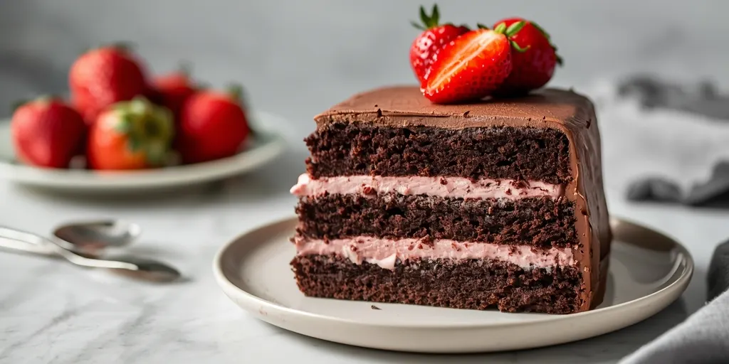 A rich and indulgent chocolate cake layered with a fresh strawberry cream filling, perfect for celebrations and special occasions.