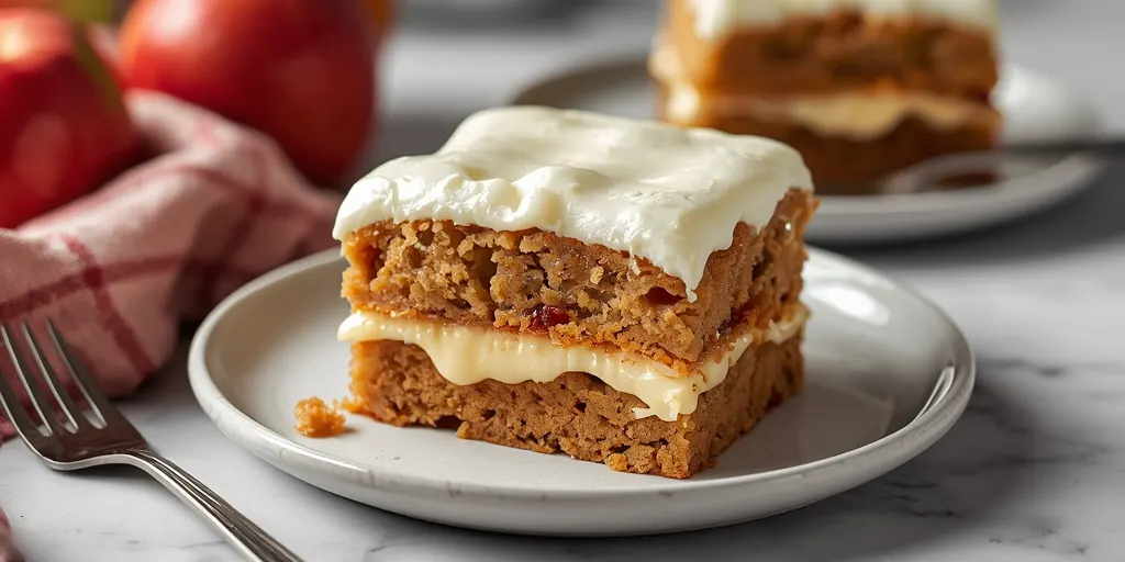 A delicious apple cake topped with a rich and tangy cream cheese icing, perfect for any occasion.