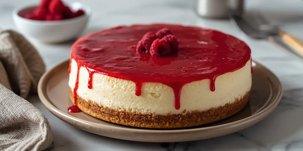 A luscious, creamy cheesecake topped with a vibrant raspberry glaze that adds the perfect touch of tartness.