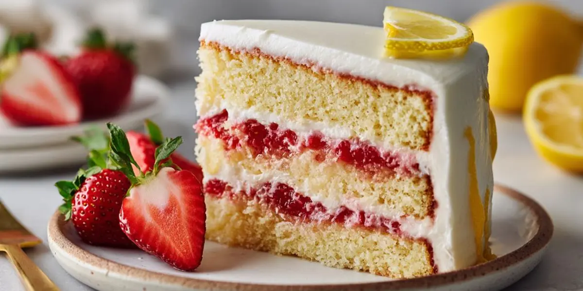 A delightful blend of strawberries and lemons in a layered cake, perfect for any celebration.