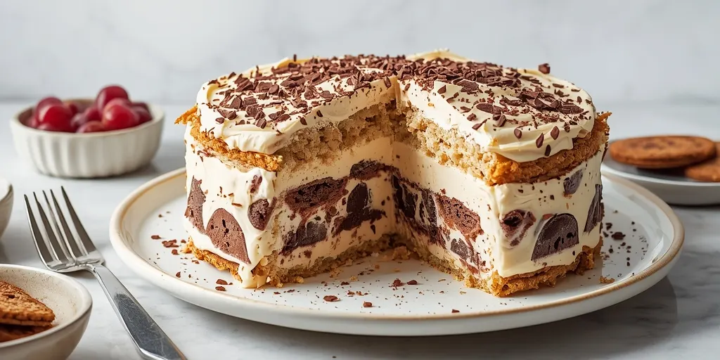 Pro Tips: Ensure each layer of ice cream is slightly firm before adding the next. Ingredient Substitutions: Try using different flavored ice cream sandwiches or toppings. How to Serve: Pair with fresh fruit or a drizzle of chocolate syrup. Storage & Freshness: Wrap tightly and store in the freezer. Make-Ahead Tips: Prepare the cake a day ahead to allow it to firm up properly.