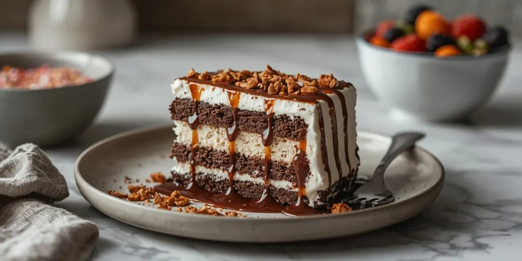 A delightful no-bake dessert perfect for summer parties, combining layers of ice cream sandwiches, chocolate syrup, and whipped cream.