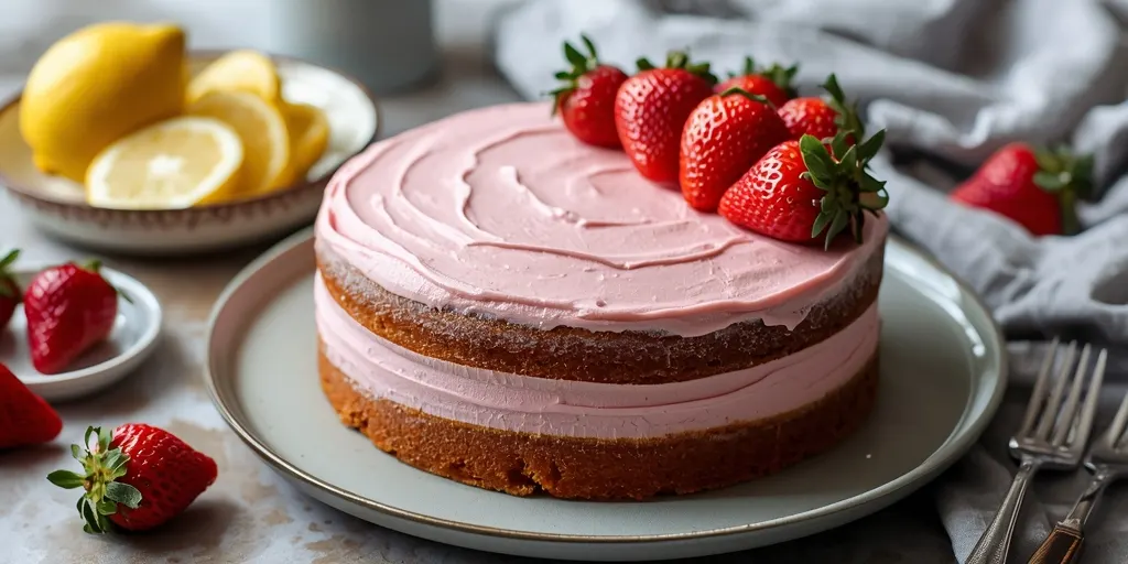 A delightful Pink Strawberry Lemonade Cake with an aesthetic decoration, perfect for any celebration.