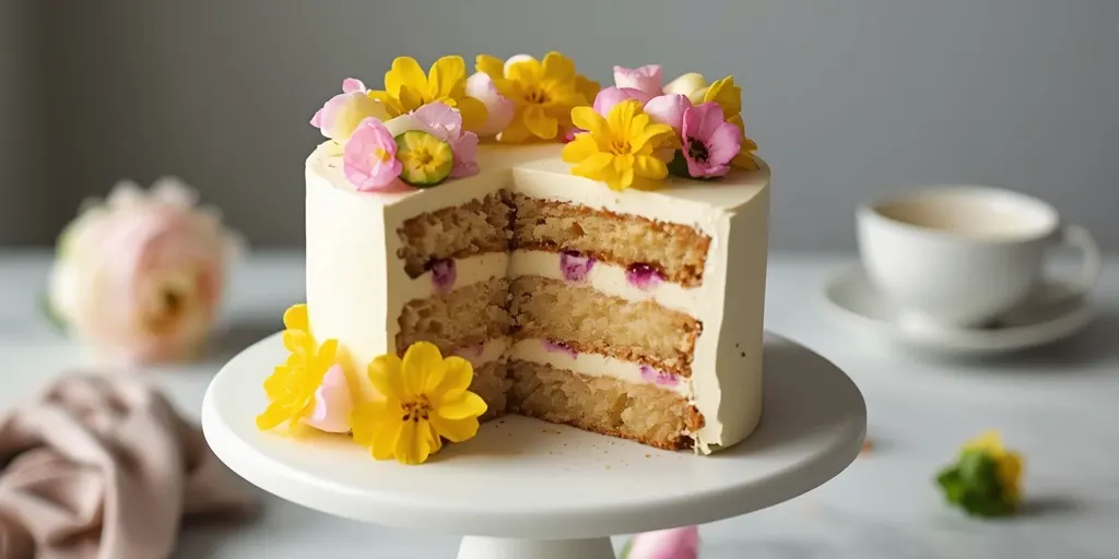 This delightful floral vanilla layer cake captures the essence of spring with its tender sponge layers, light buttercream, and edible flower decoration. Perfect for any spring celebration.