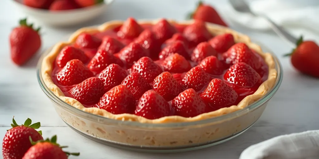 A beautiful and delicious strawberry pie served in a glass dish, perfect for any occasion. Made with fresh strawberries for a burst of flavor.