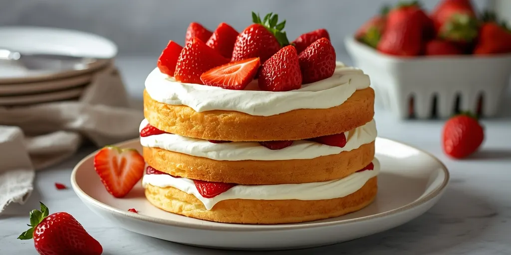 This strawberry shortcake cake features layers of fluffy cake, fresh cream, and strawberries. Perfect for any celebration or as a delightful treat.